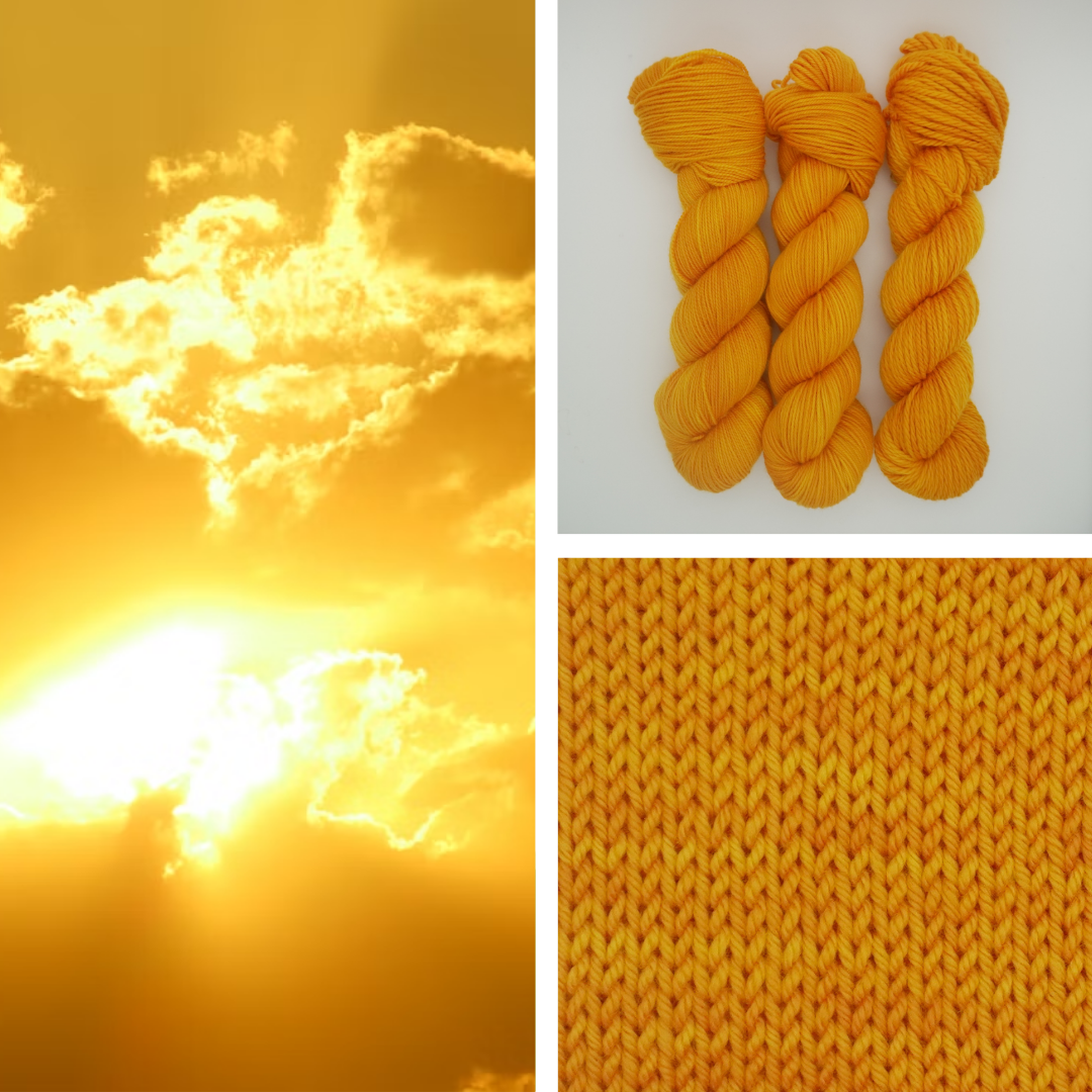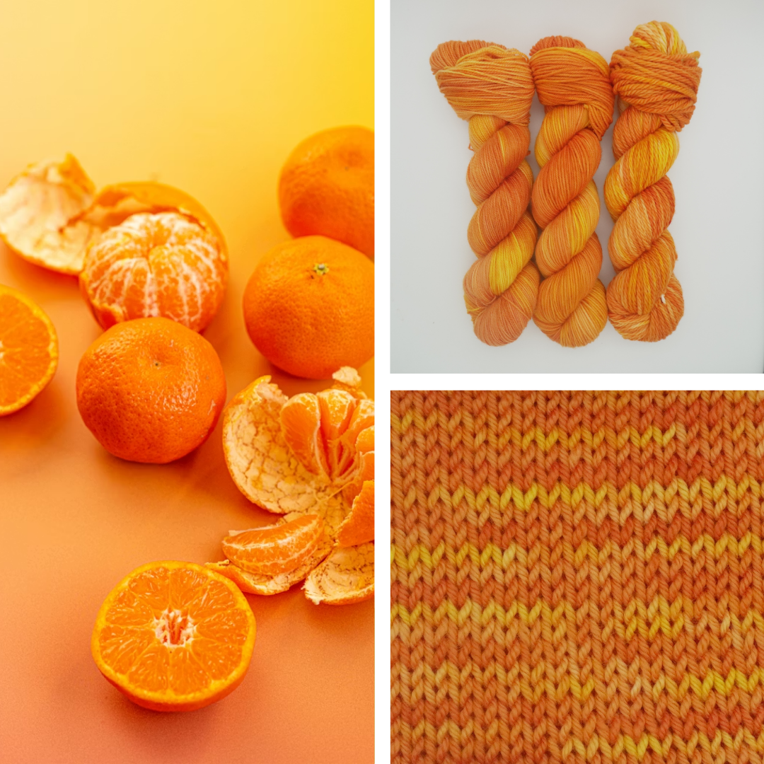 Tangerine Twist is a zesty, sun-kissed colorway bursting with vibrant oranges, golden yellows, and hints of coral, like a summer citrus cocktail spun into yarn