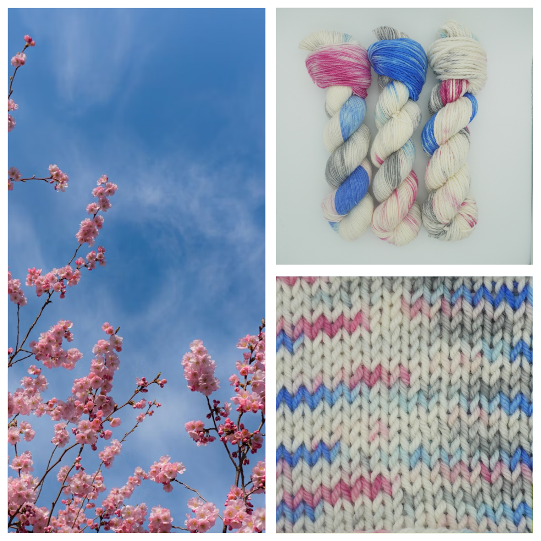 Breezy Blossoms captures the soft, uplifting feeling of spring carried on a gentle breeze. This delicate colorway blends airy sky blues with blush pink petals, layered over a creamy base and kissed with subtle speckles of grey.