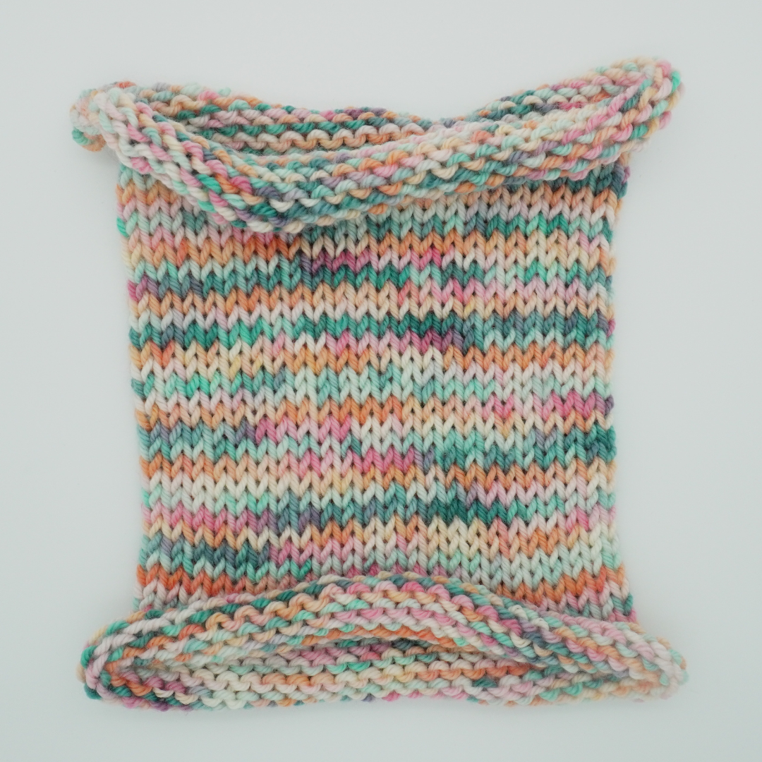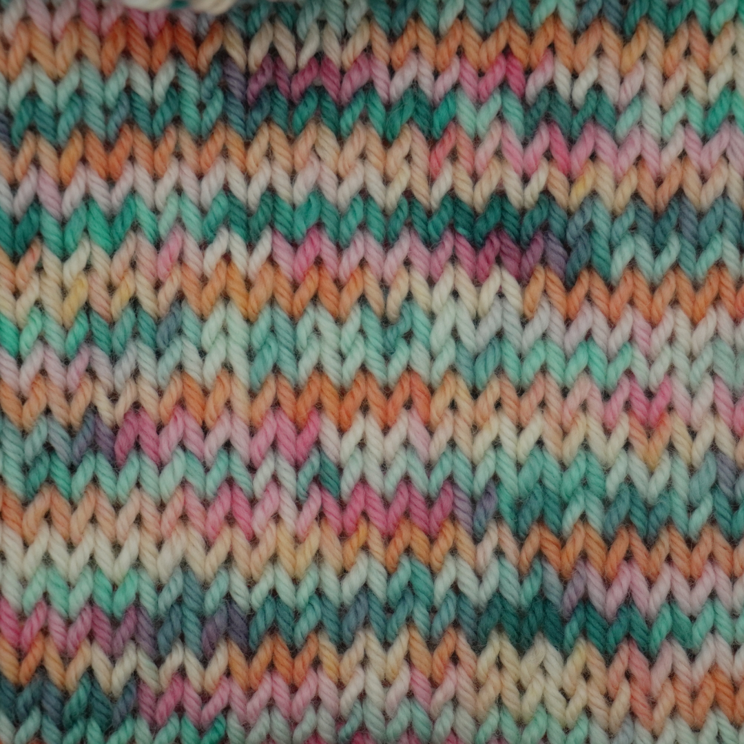 The yarn feels good in the hand and works up into a pleasing fabric. The colors are a heavenly treat for the eyes.