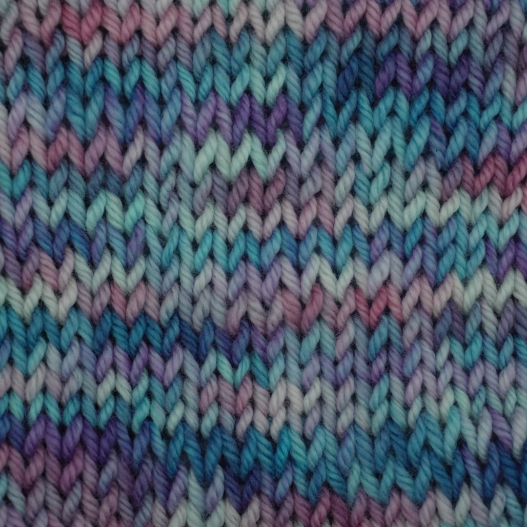 The yarn feels good in the hand and works up into a pleasing fabric. The colors are a heavenly treat for the eyes.