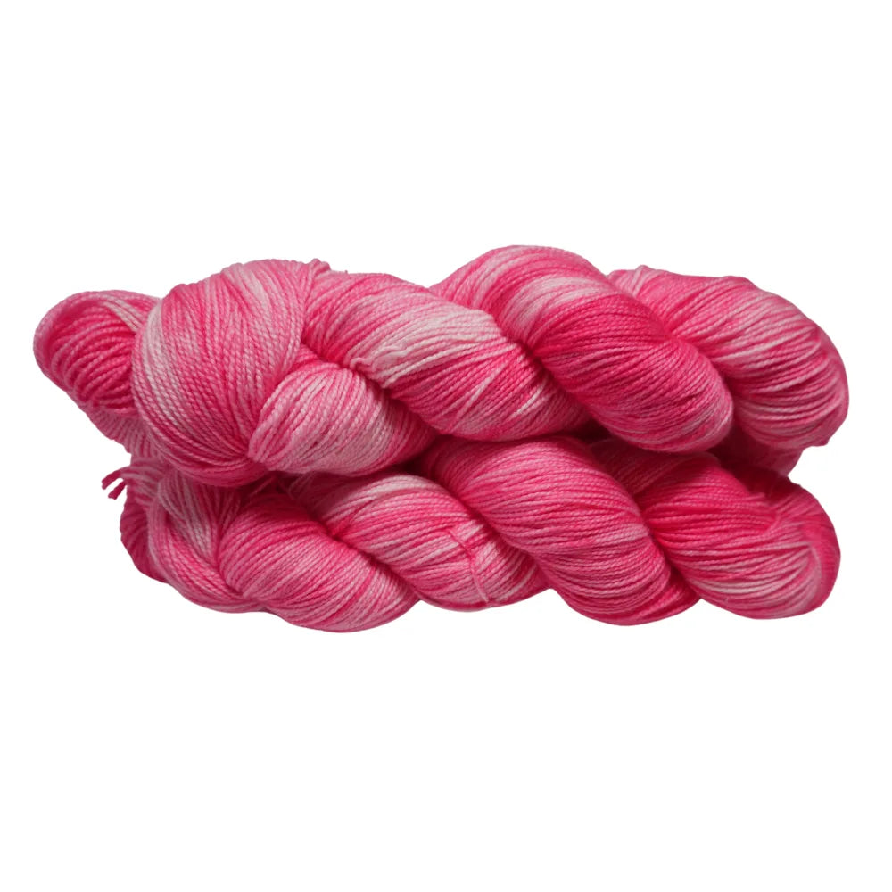 Sock Weight 80% Superwash Merino Wool 20% Nylon; 400 Yards; 100 Grams; 2ply Bubble Gum Pop, features a playful blend of vibrant pinks and soft blush tones, reminiscent of sweet candy store delights