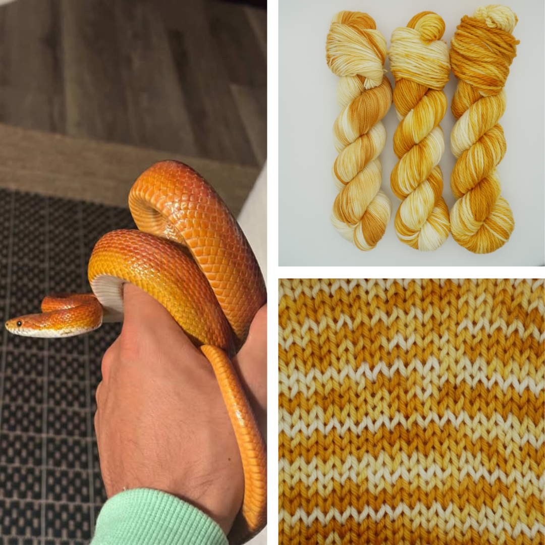 Calcifer is the perfect name for this cute little snake, and we just couldn't resist making a colorway inspired by him. If you know you know. Just like little Calcifer, we dyed the top of the yarn orange, and left the bottom white to mimic the natural color of the snake's belly. Thank you Julia so much for sending us these wonderful photos.