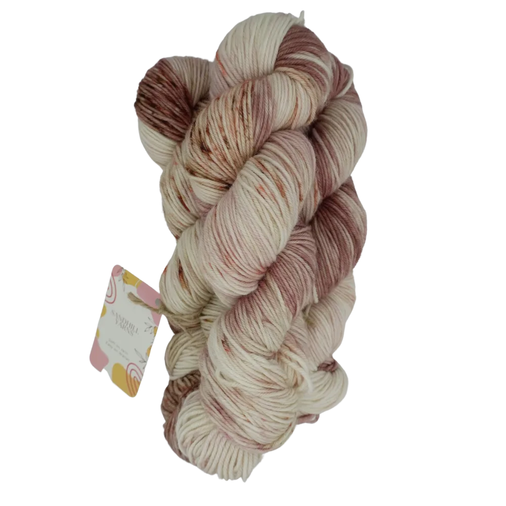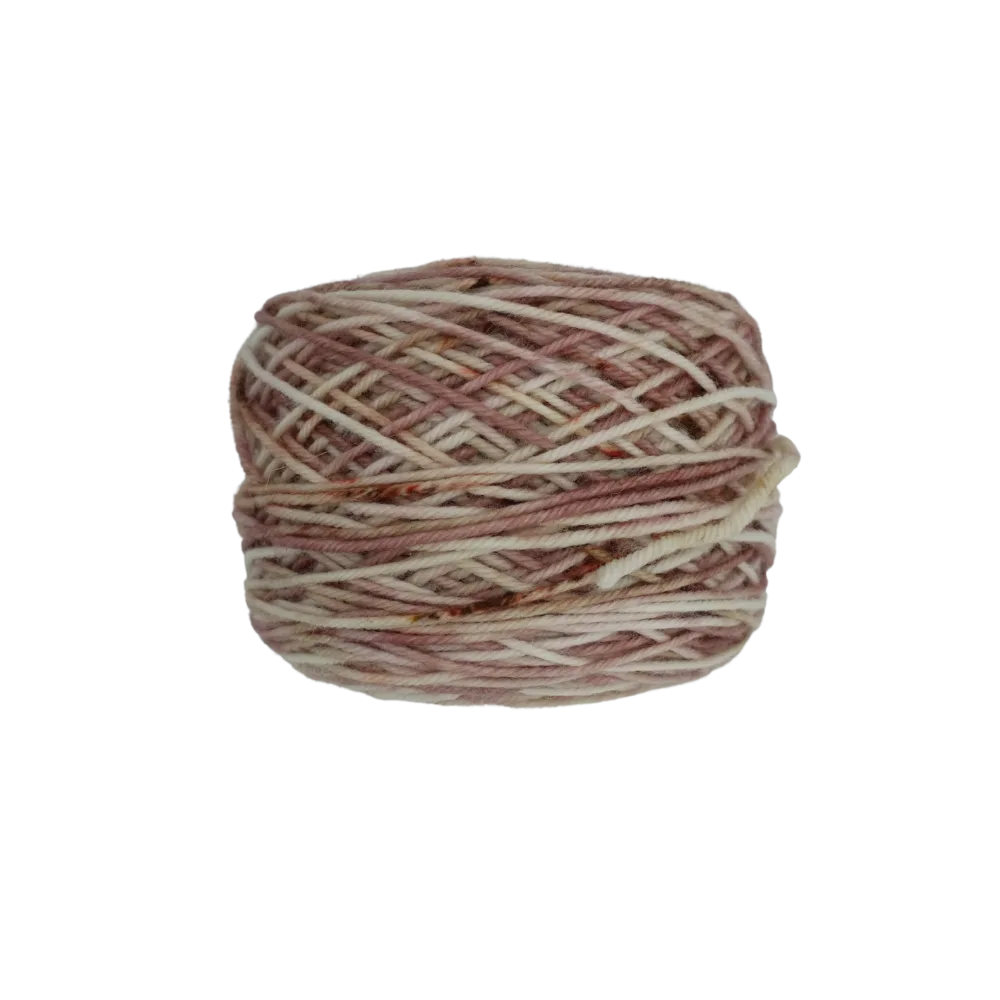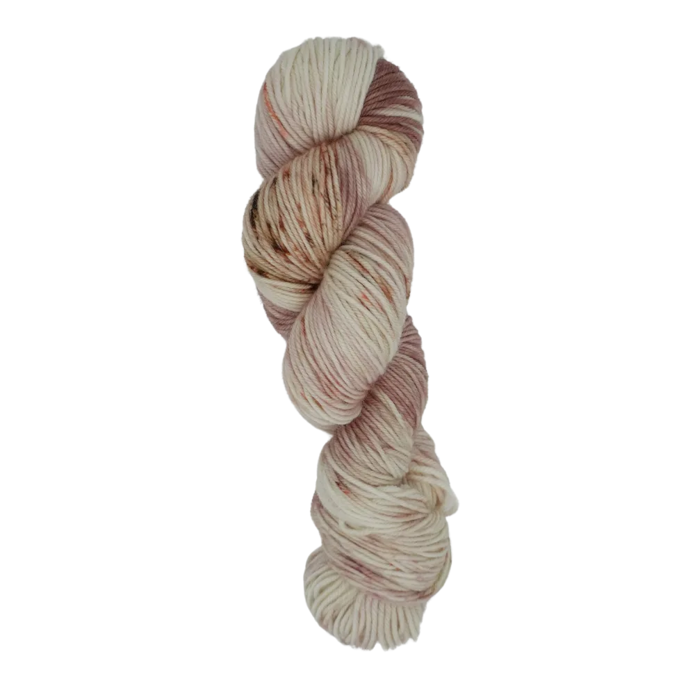 DK Weight 100% Superwash Merino; 231 yds/100g; 4 ply Champagne Brunch features soft blush pinks and earthy speckles, perfect for creating warm, elegant knits with a touch of rustic charm.