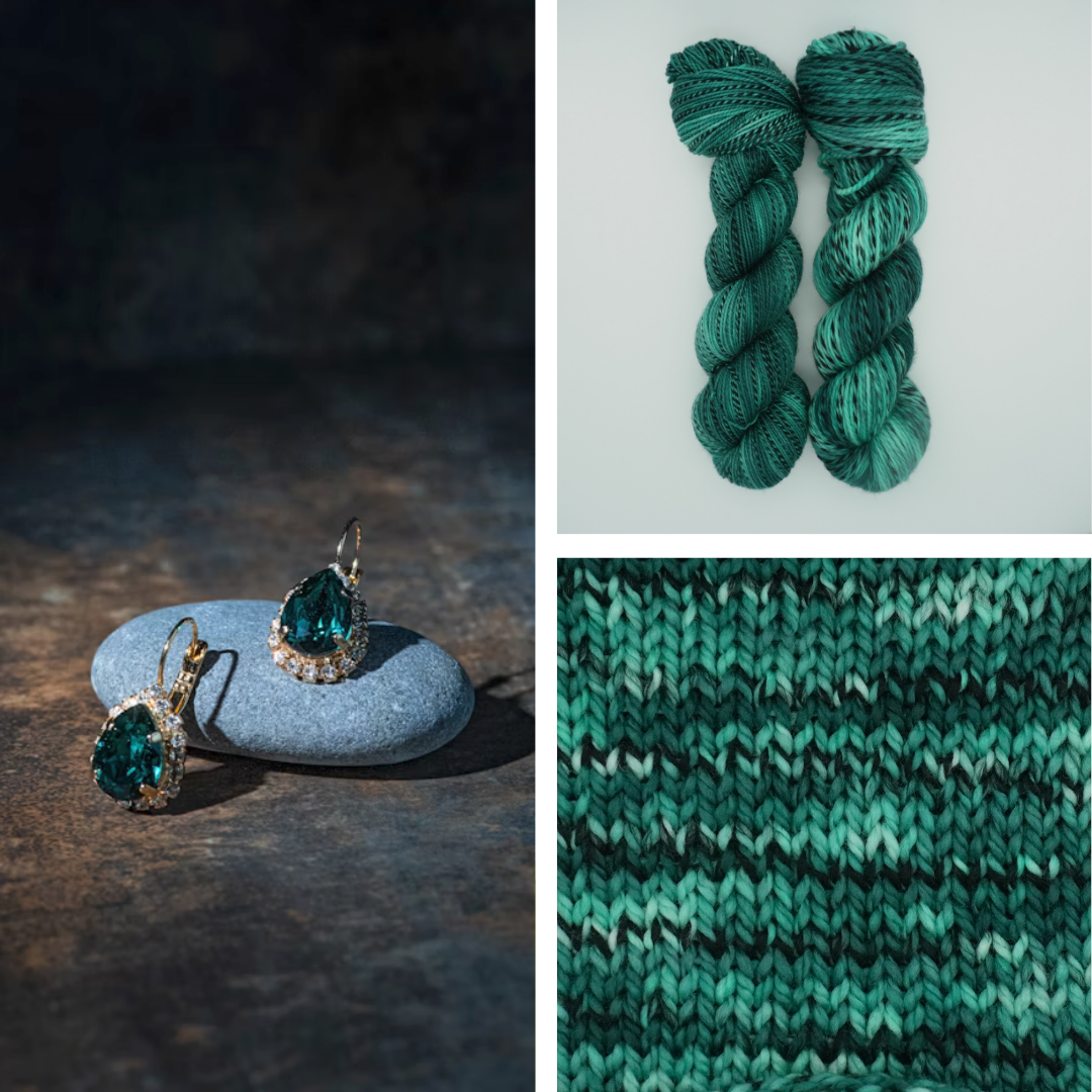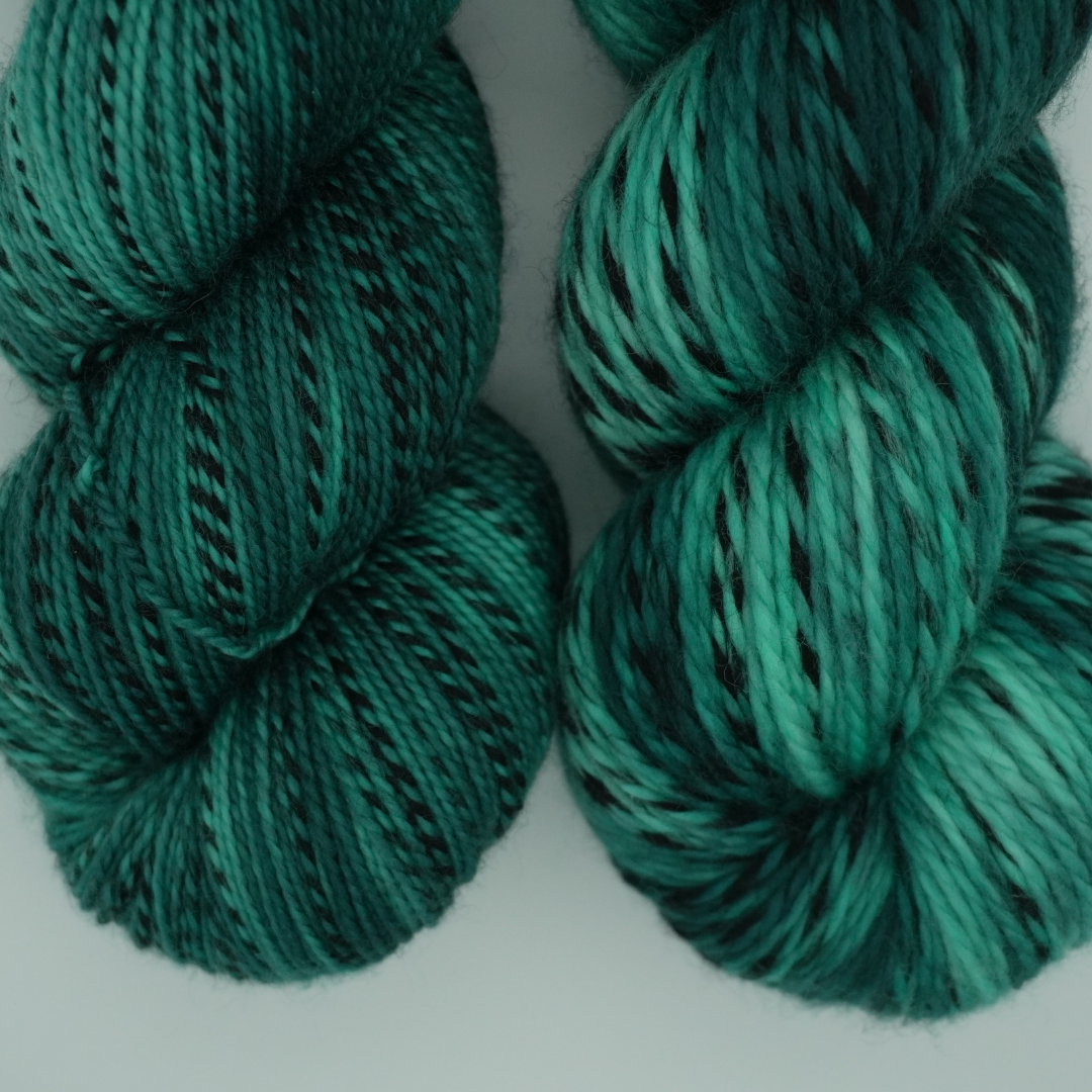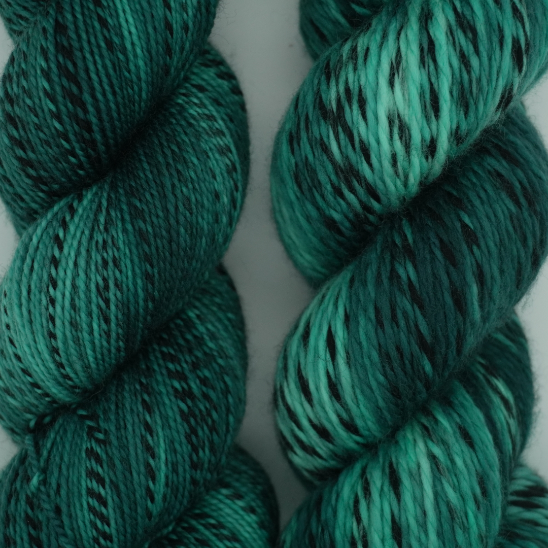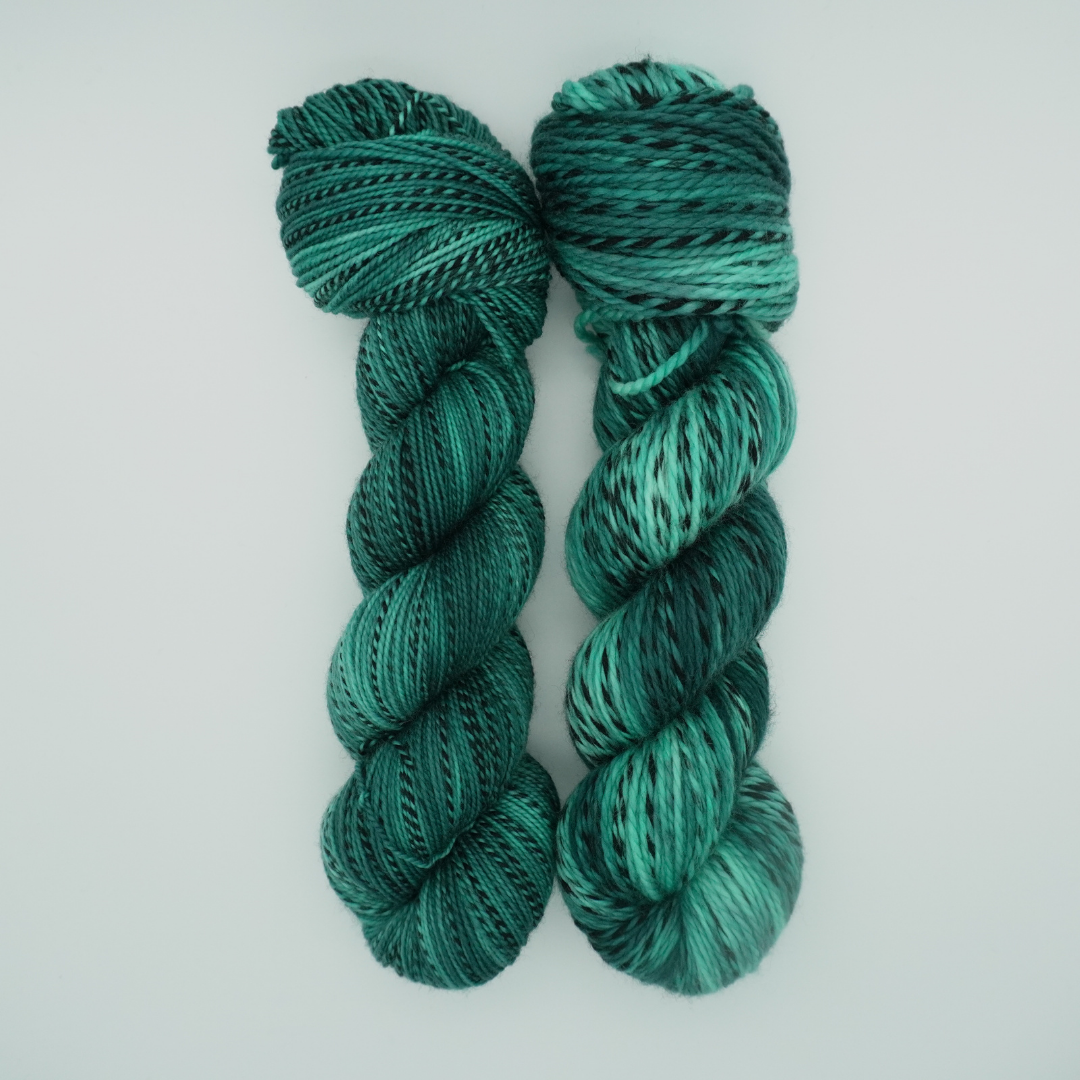 Crown Jewel is a rich, regal blend of deep aqua blues and teals that shimmer like precious gemstones. Our Zebra variant uses the same colors, but this time around, we dyed it on the Zebra yarn base