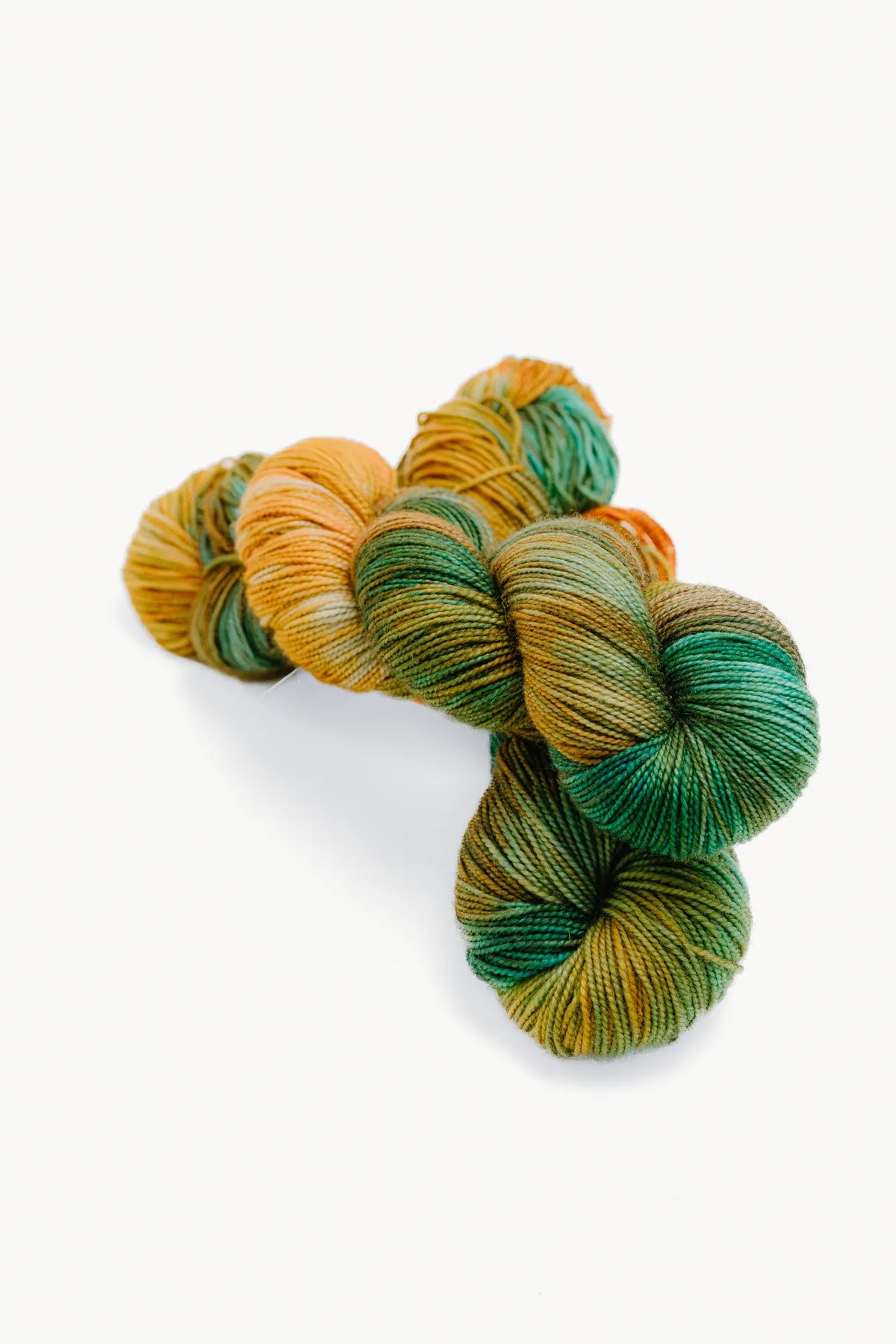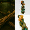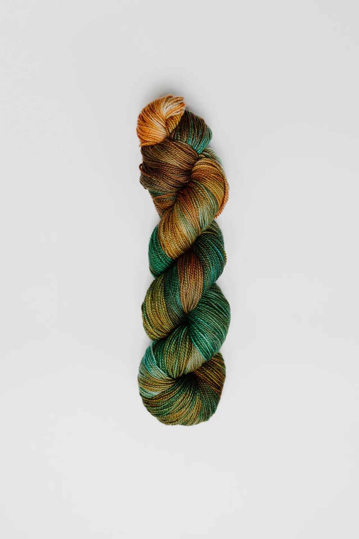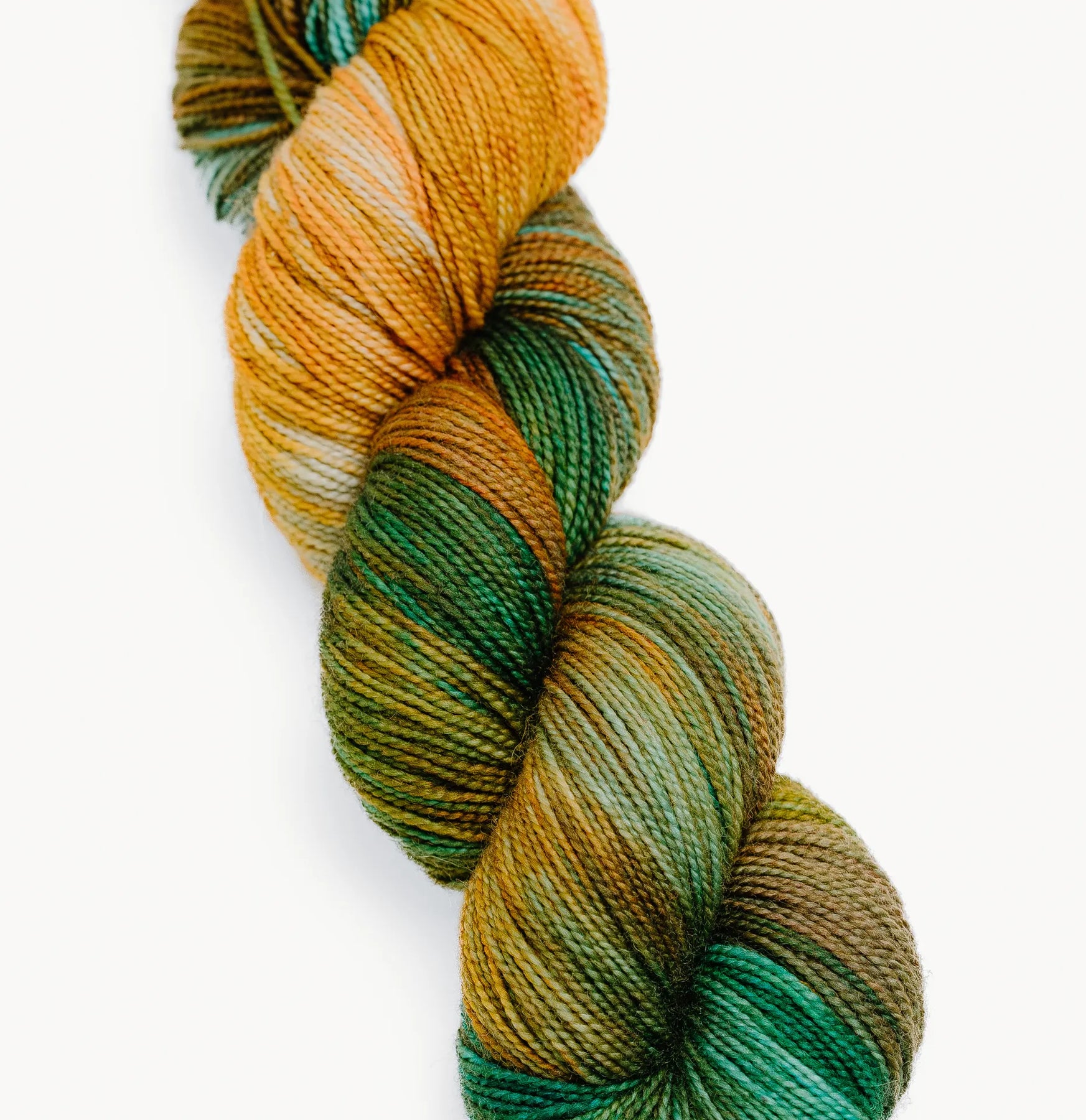 Sock Weight 80% Superwash Merino Wool 20% Nylon; 400 Yards; 100 Grams; 2ply Driftwood is a rich, earthy colorway blending warm golden browns, deep forest greens, and hints of teal, evoking the beauty of weathered wood and mossy shores.
