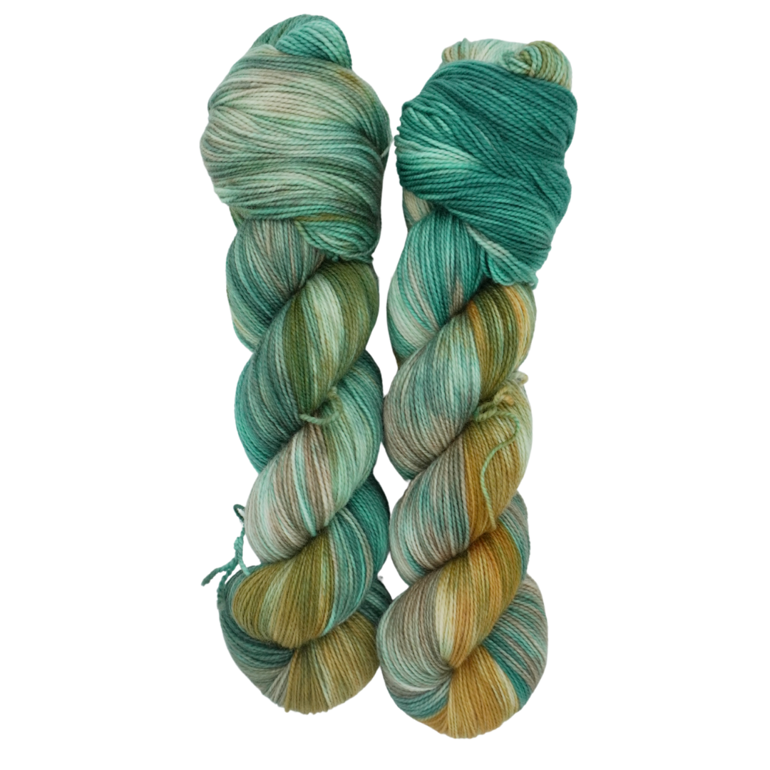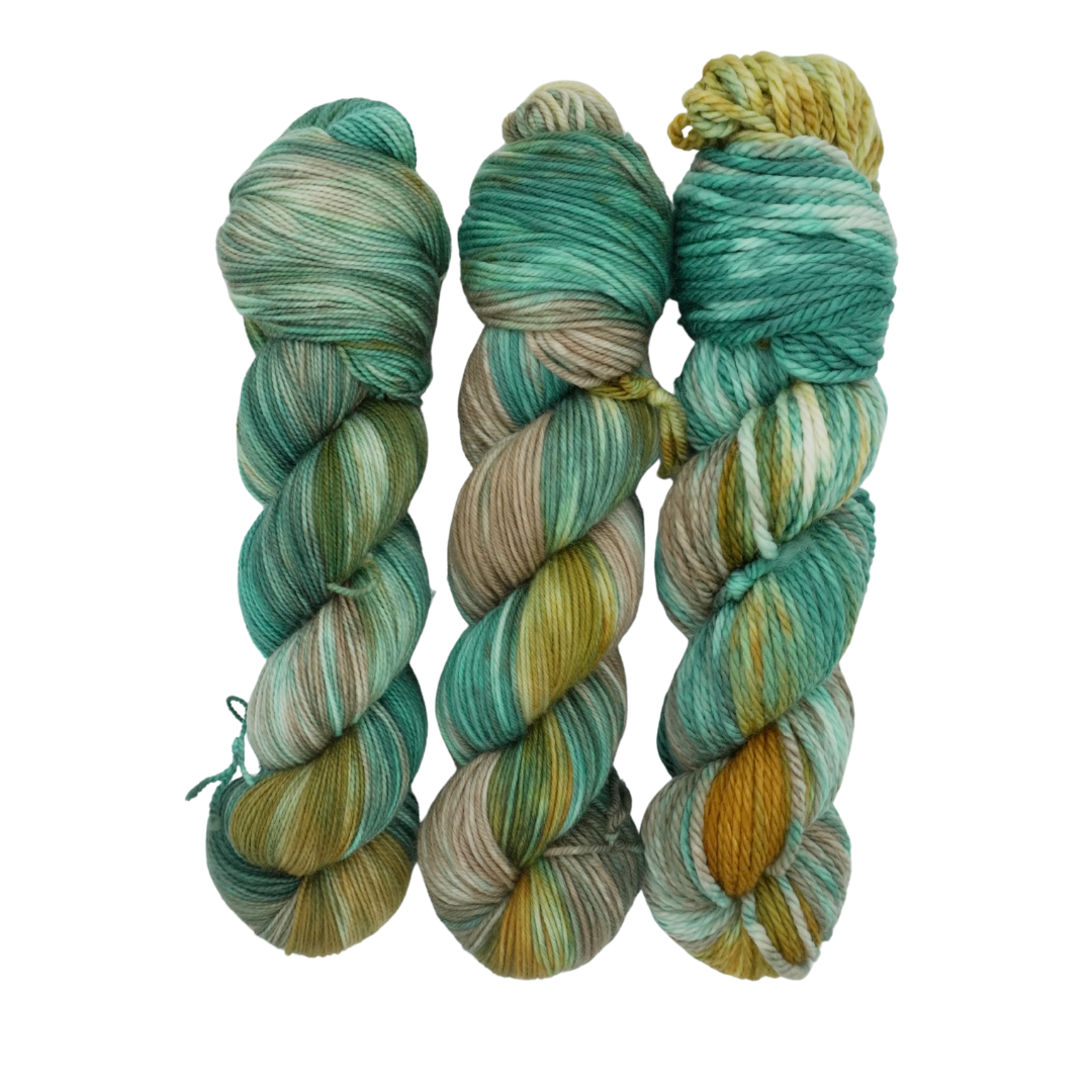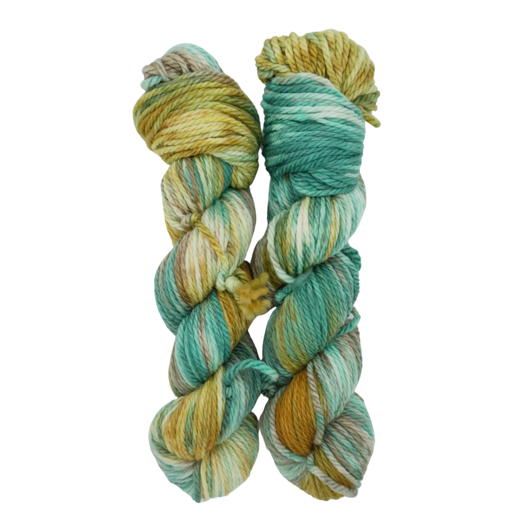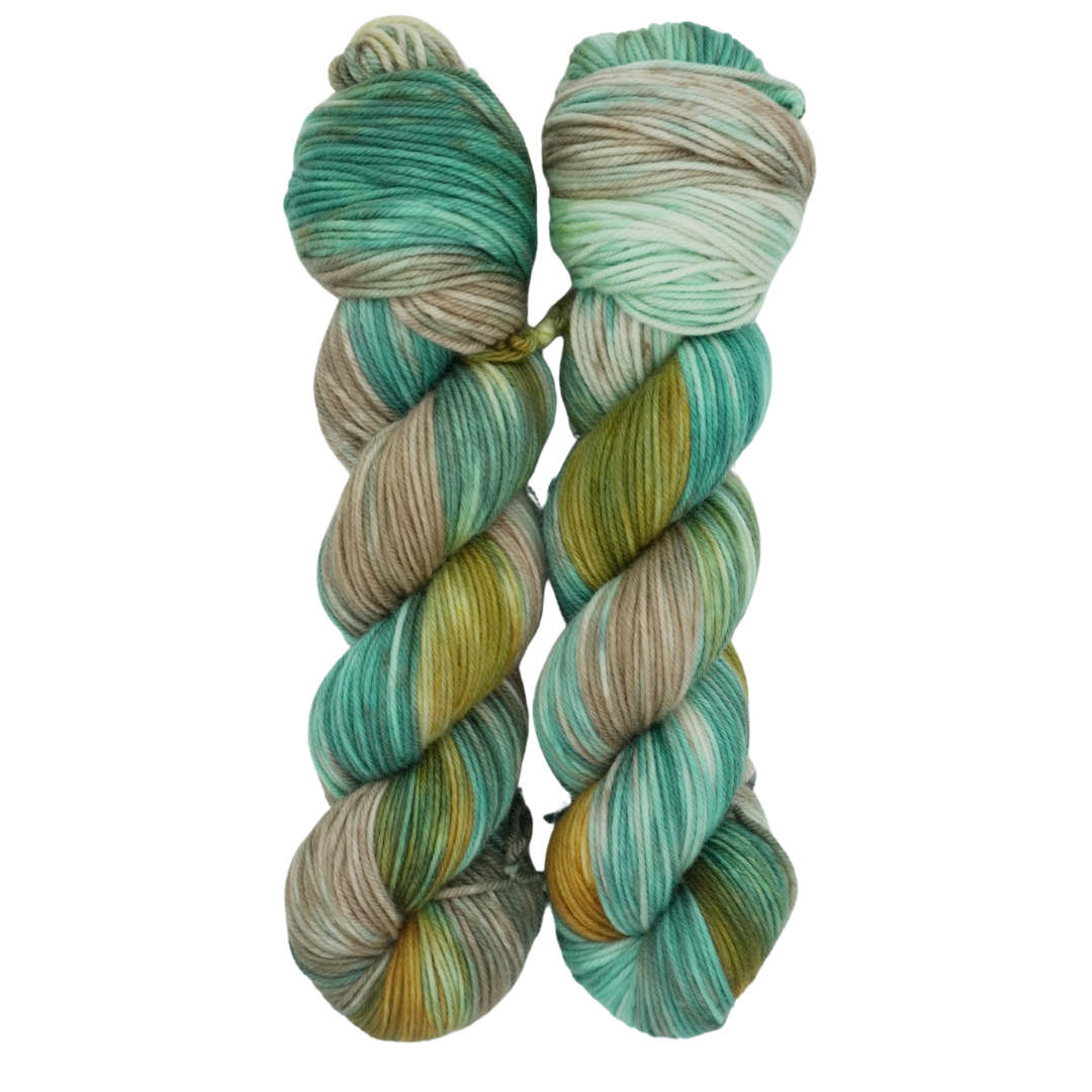 Driftwood is a rich, earthy colorway blending warm golden browns, deep forest greens, and hints of teal, evoking the beauty of weathered wood and mossy shores.