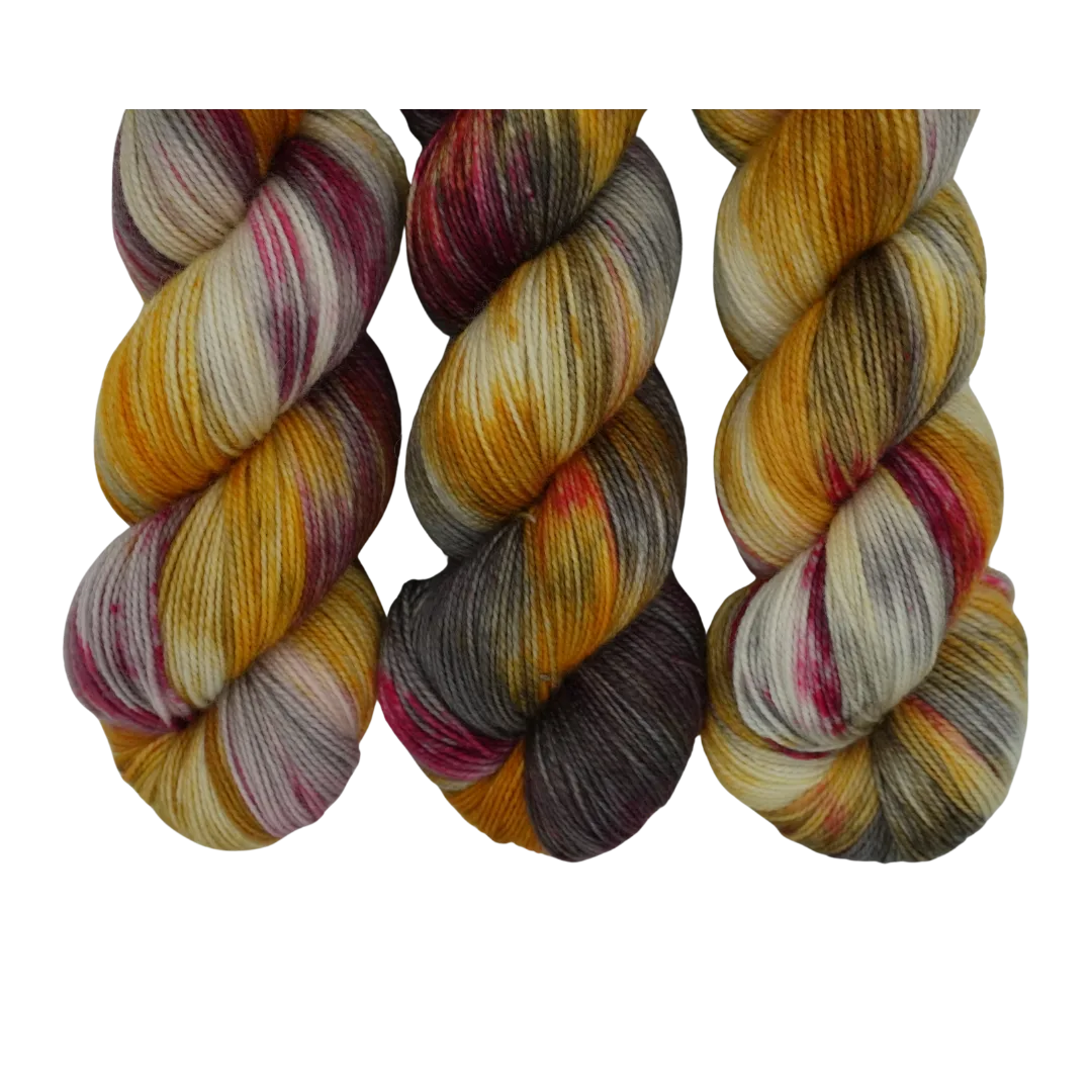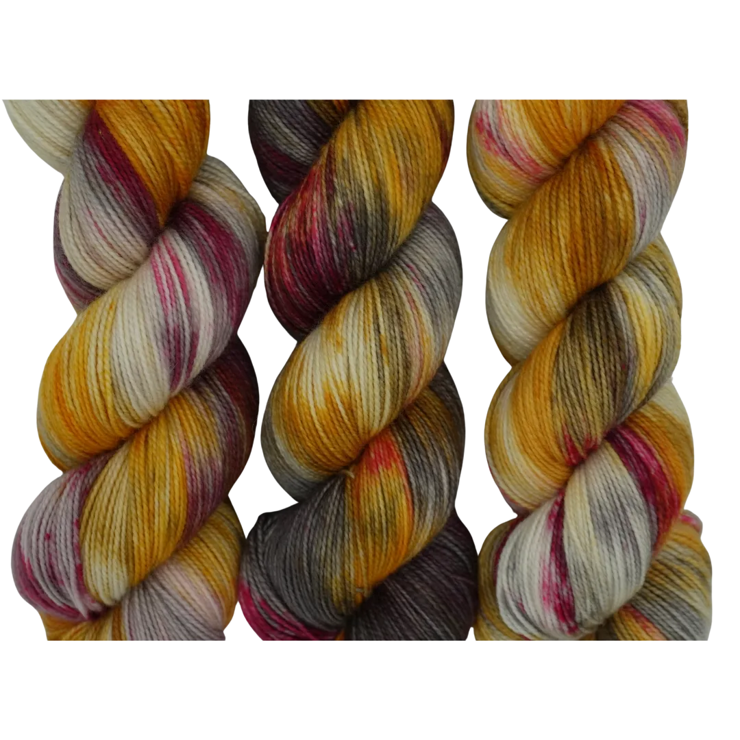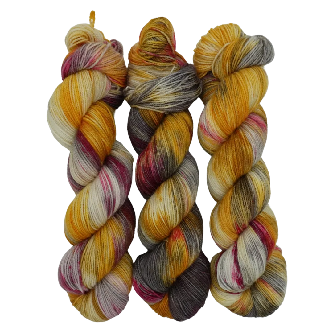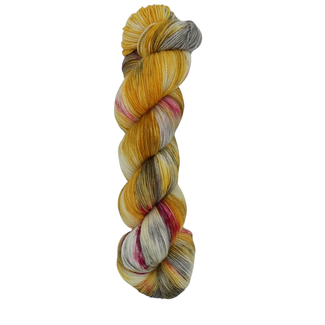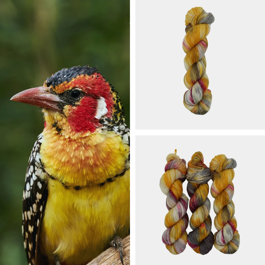 Sock Weight 80% Superwash Merino Wool 20% Nylon; 400 Yards; 100 Grams; 2 ply Firecrest is a vibrant colorway inspired by the Red and Yellow Barbet, blending golden yellows, fiery reds, deep charcoals, and soft creams into a striking, avian-inspired palette.
