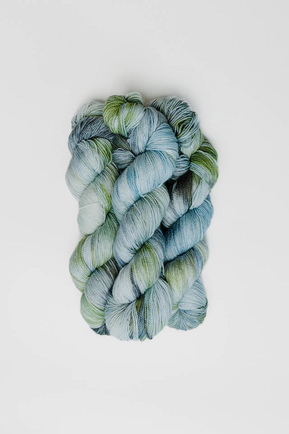 Glacial Shores is a tranquil, icy colorway that flows with cool blues, frosty grays, and hints of mossy green, like the serene meeting point of frozen waters and rugged earth.