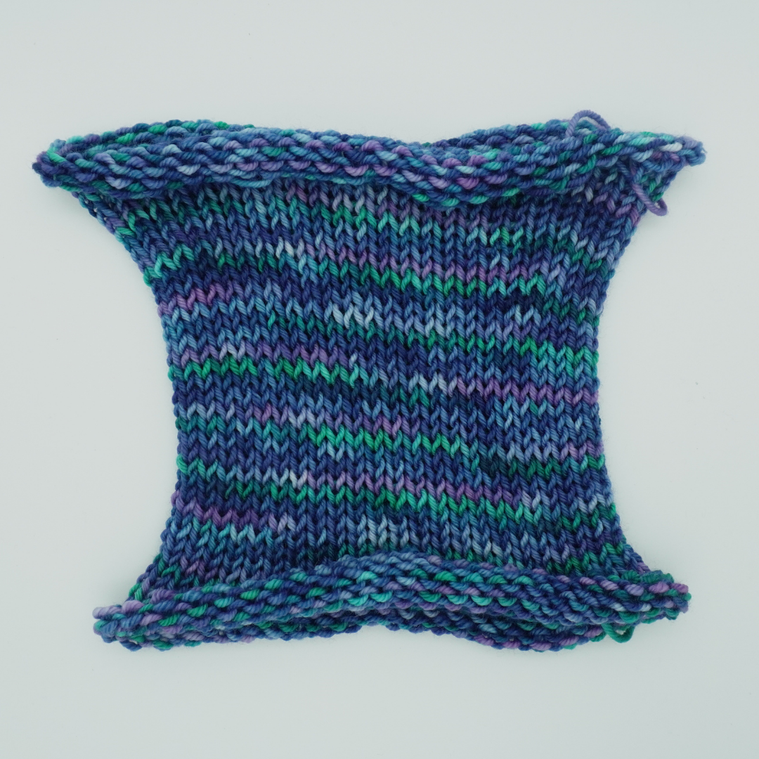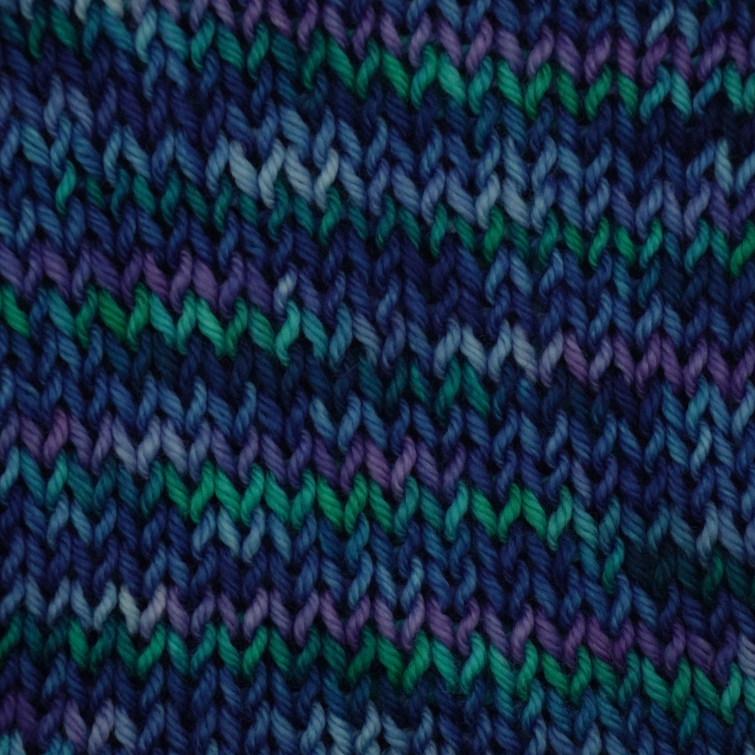 Deep blues paired with light purple and a solid teal. If you're a lover of the deep sea colors, you'll love this yarn.