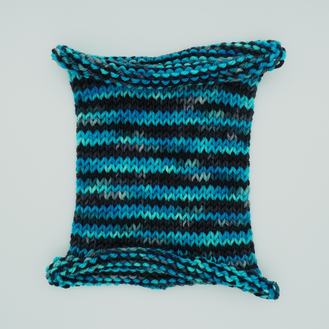 The yarn feels good in the hand and works up into a pleasing fabric. The colors are a heavenly treat for the eyes.