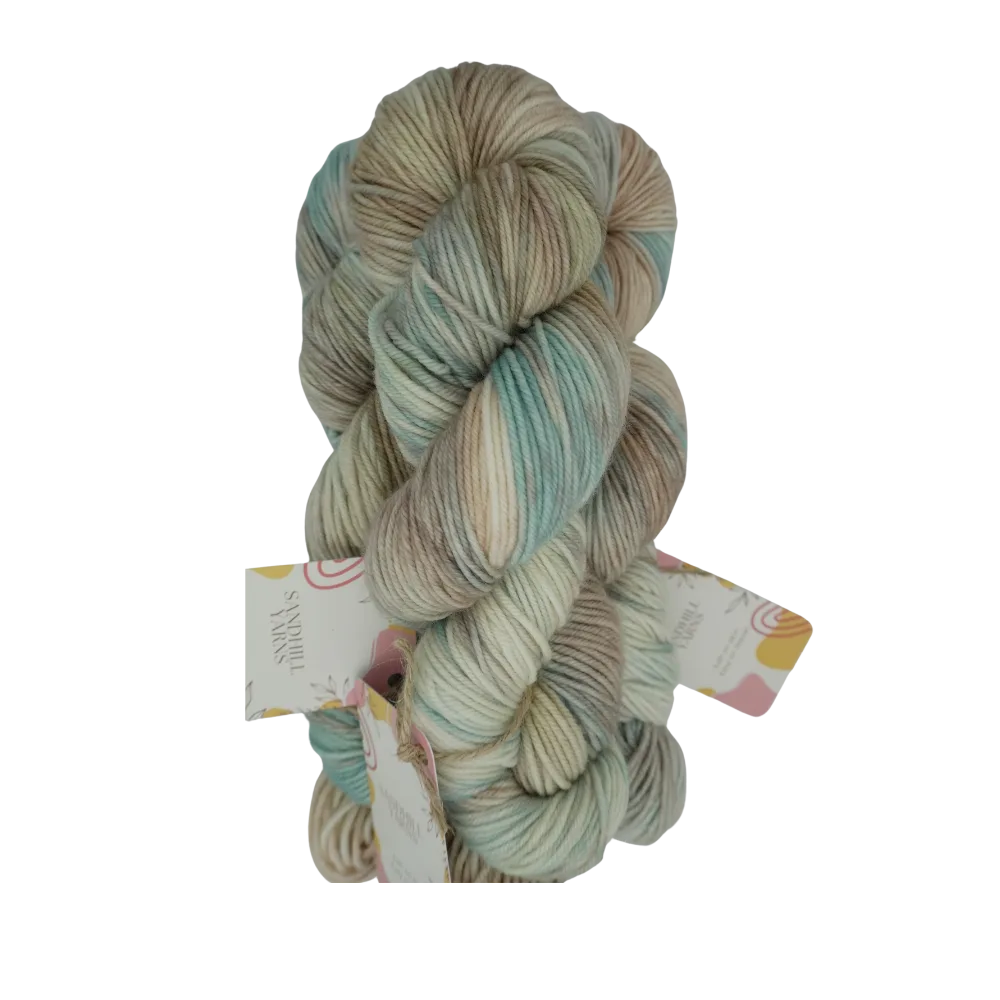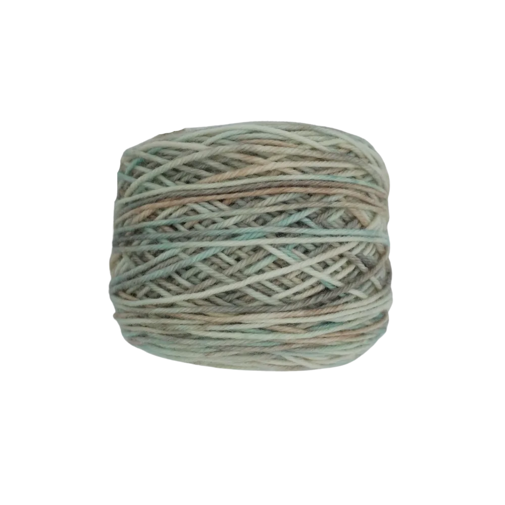 DK Weight 100% Superwash Merino; 231 yds/100g; 4 ply Seafoam and Shells blends soft seafoam blue, cream and vintage mauve that blends with subtle browns, capturing the serene essence of a coastal shore.