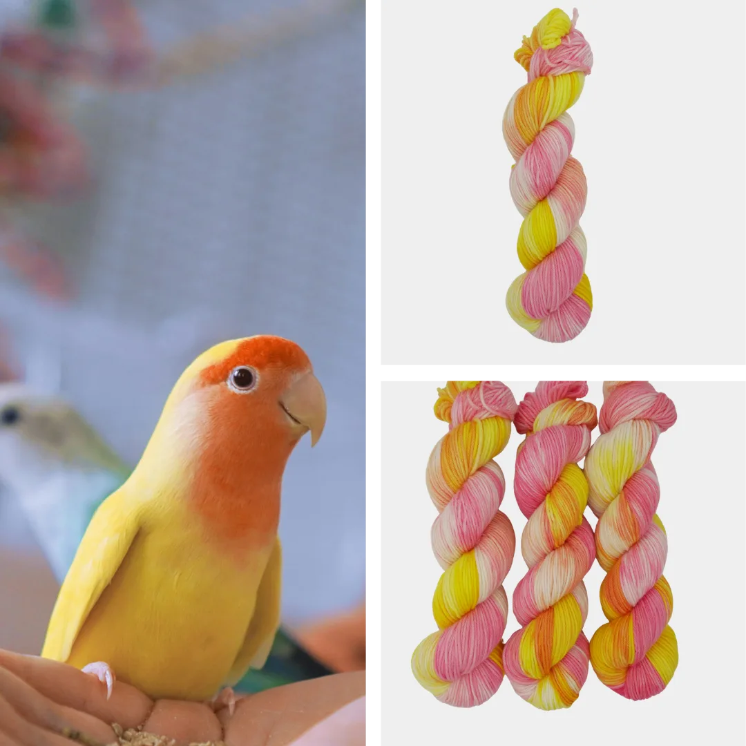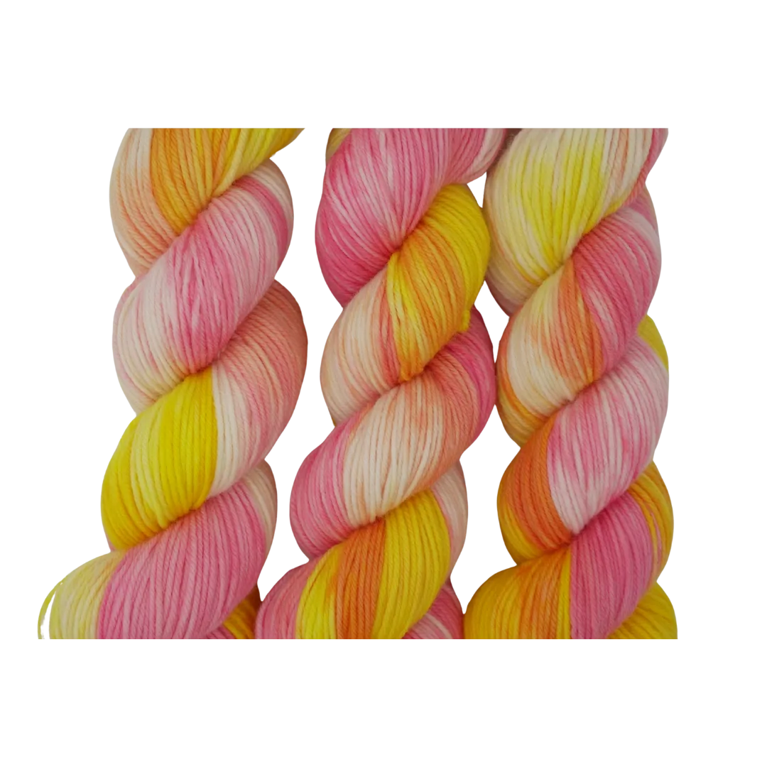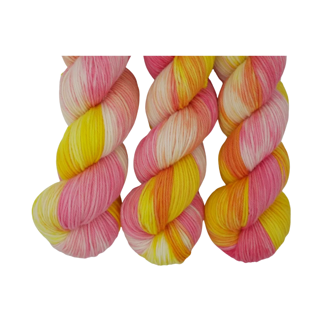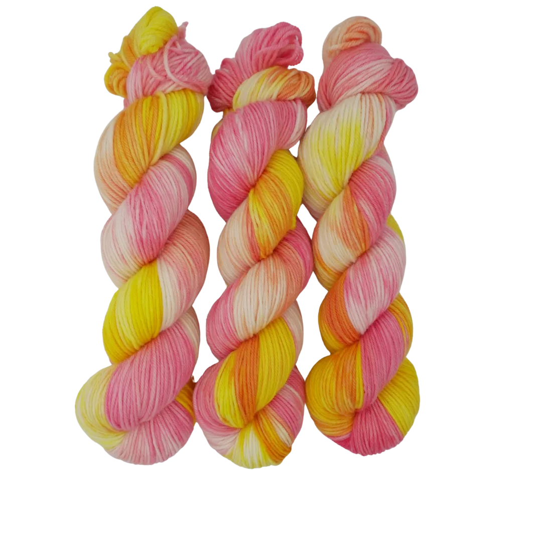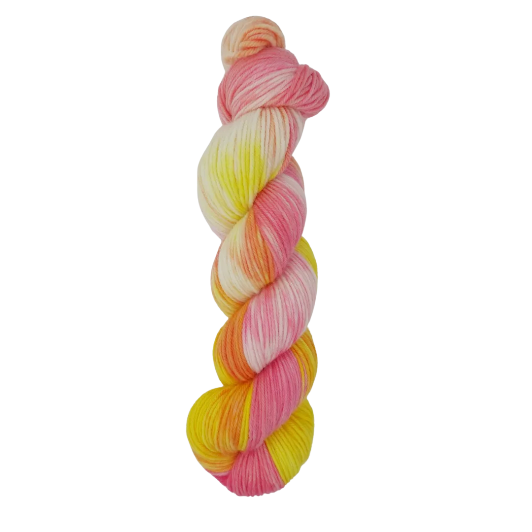DK Weight 100% Superwash Merino; 231 yds/100g; 4 ply Sweet Cheeks is a cheerful colorway that blends bright pinks, sunny yellows, and soft peaches for a playful, heartwarming palette.